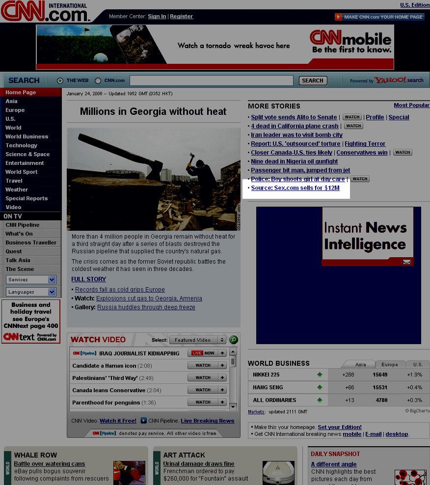 These were some quick screenshots I got from the sale of Sex.com for $12 million (earlier reports reported $14 million as the sale price, later revised to $12 million). There were a lot of headlines around the world that day, on TV, Newspapers, and Radio, and I gathered a few online ones from different countries below. Click on them to enlarge them. Let there be no doubt, when TheRecordBreakingDomain.com breaks Sex.com's record, it will be all over the news across the globe and, due to the circumstances of the sale, will get a lot more attention.
